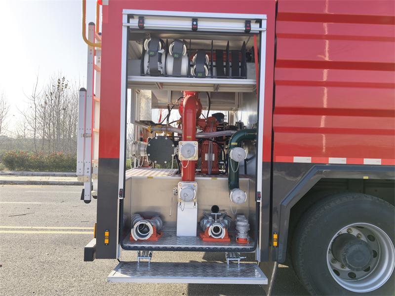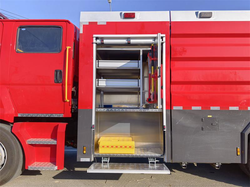 • Bilik Peralatan: Terletak di bahagian hadapan superstruktur kenderaan, bilik ini dilengkapi dengan rak peralatan dan rak gantung tarik keluar. Rak direka secara logik untuk menyimpan pelbagai peralatan pemadam kebakaran (sut api, selimut api, penutup hos, jambatan api, alat pemadam api, dll.); rak gantung tarik keluar menyediakan akses mudah dan cepat kepada peralatan yang biasa digunakan seperti kapak api, pencungkil, penyodok, sepana, tukul dan palang, meningkatkan kecekapan menyelamat.