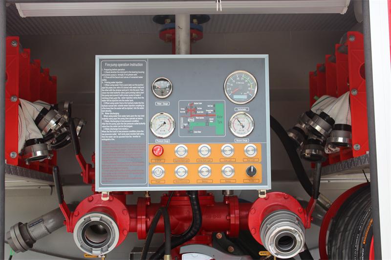 Panel kawalan: Terletak di dalam bilik pam, ia menyepadukan tolok paras air, tolok tekanan, tolok vakum, takometer, brek kecemasan, lampu bilik peralatan, lampu bilik pam, lampu sisi, lampu ekor, suis penyebuan, suis kuasa utama, pendikit elektronik, dan butang lain; arahan operasi pam bomba, gambar rajah paip tangki air, dsb. Antara muka adalah intuitif, memudahkan pemantauan masa nyata dan pengendalian butang yang berkaitan oleh bomba.