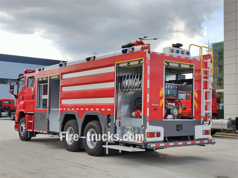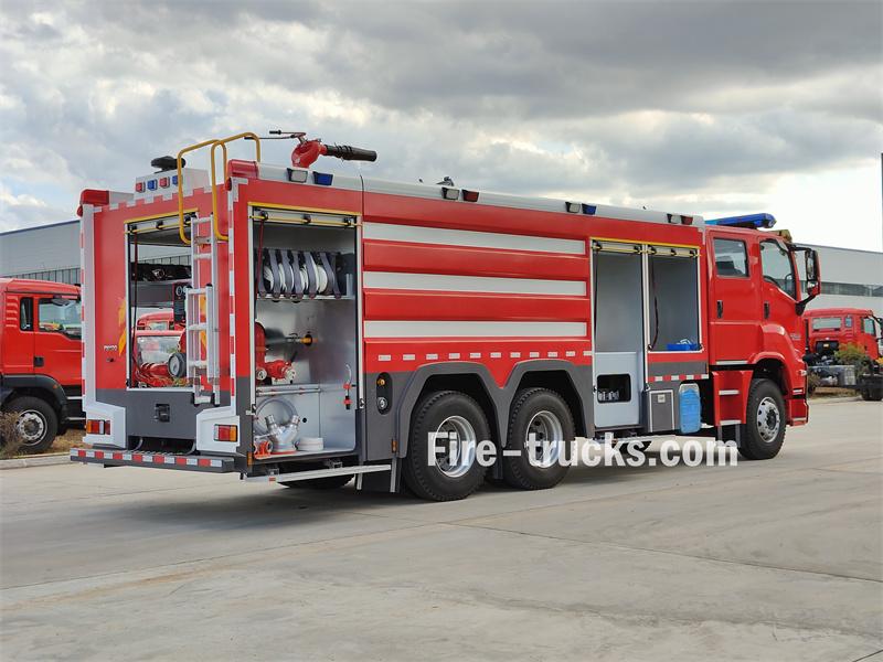 Trak bomba buih Isuzu GIGA 6X4 10 meter padu diasaskan pada casis Isuzu GIGA 6X4, dengan jarak roda 4600mm+1370mm. Ia dilengkapi dengan enjin Isuzu 6UZ1-TCG61 dan transmisi 12-kelajuan Pantas. Bahagian hadapan bangunan besar menempatkan petak peralatan, bahagian tengah mengandungi tangki air keluli karbon 8500L dan tangki buih keluli tahan karat 1500L, dan bahagian belakang adalah bilik pam, dilengkapi dengan pam bomba CB10/60-XZ, panel kawalan, hos kebakaran, peralatan memadam kebakaran, dsb. Pemantau kebakaran PL8/48 terletak di atas bumbung.
